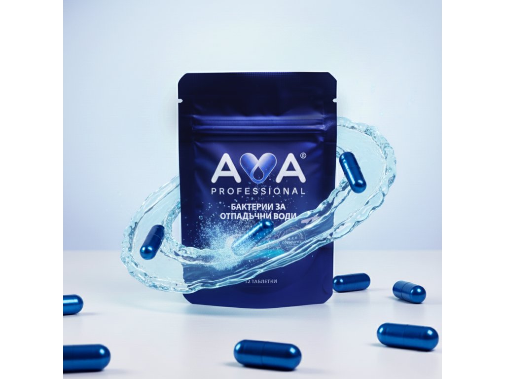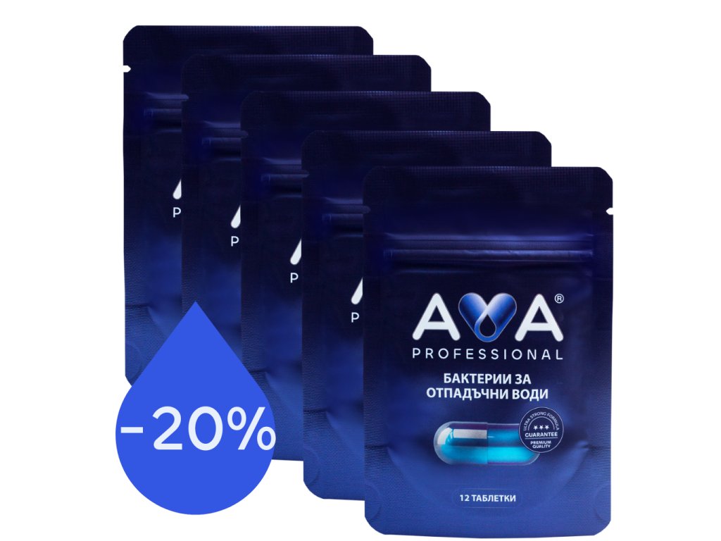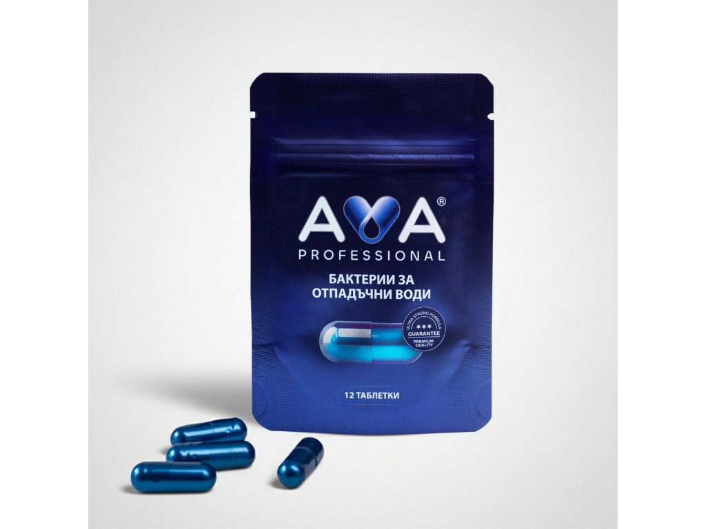 Опаковката AVA бактерии съдържа 12 таблетки за пречиствателни станции и септични ями (6 месеца поддръжка).