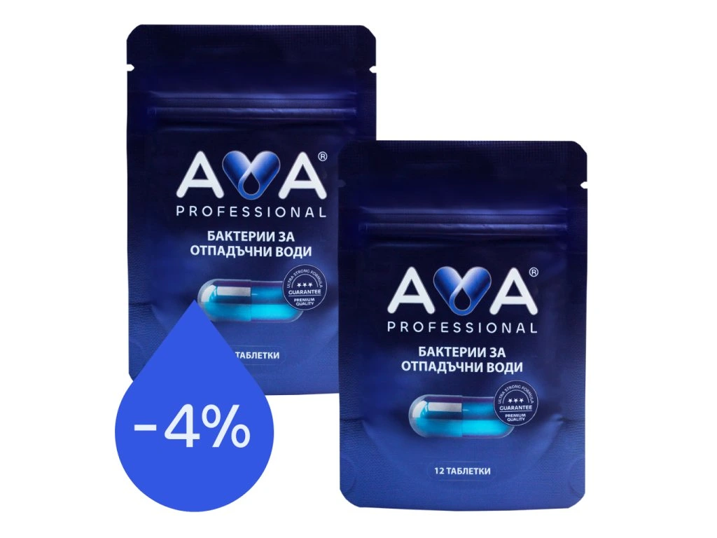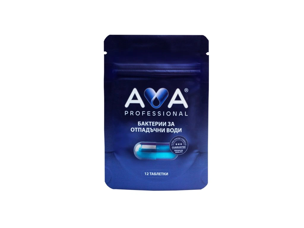 Опаковката AVA бактерии съдържа 12 таблетки за пречиствателни станции и септични ями (6 месеца поддръжка).